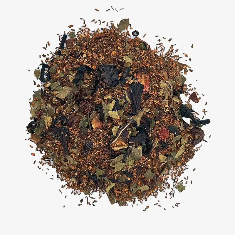 Passion Fruit Red Tea is naturally caffeine-free, making it a relaxing and hydrating choice for any hour. Rooibos is rich in antioxidants, which may help protect the body from free radicals and support overall wellness. It also contains minerals such as calcium, magnesium, and zinc, promoting relaxation and vitality. Passion fruit, mango, and apricot add vitamins and natural compounds that can support digestion and immunity. Together, these ingredients create a nourishing, low-calorie beverage that encourages calm and balance. Enjoyed hot, it can soothe the mind and body; served iced, it provides an energizing, healthy refreshment without caffeine or added sugar.